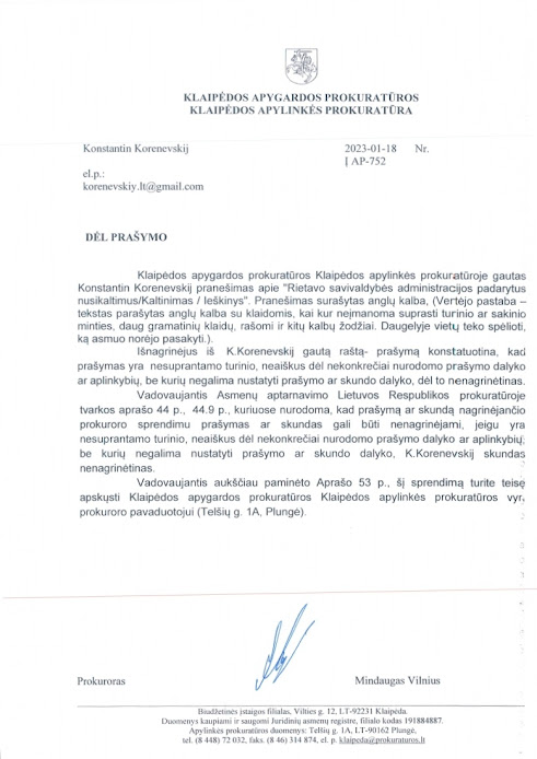Notification of crimes committed from administration of self government of Rietavas / Indictment / Lawsuit from 2022.12.11: